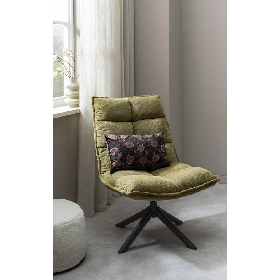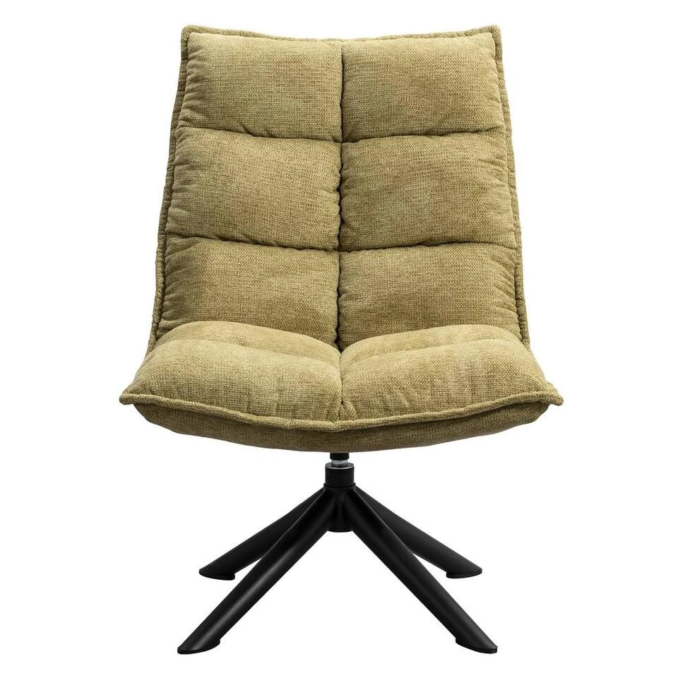 Fauteuil Clayton heeft een trendy en eigentijdse look. De stoel is bekleed met een heerlijke zachte stof in de kleur lime groen en heeft geen armleuningen. Deze stoel heeft een warme, sfeervolle en knusse uitstraling, maar wel met een robuust en hip tintje. Het onderstel is gemaakt van zwart metaal en heeft een kruisvorm. Deze stoel zit heerlijk en is een echte eyecatcher in je interieur. De fauteuil heeft een afmeting van 99x70x81 cm.