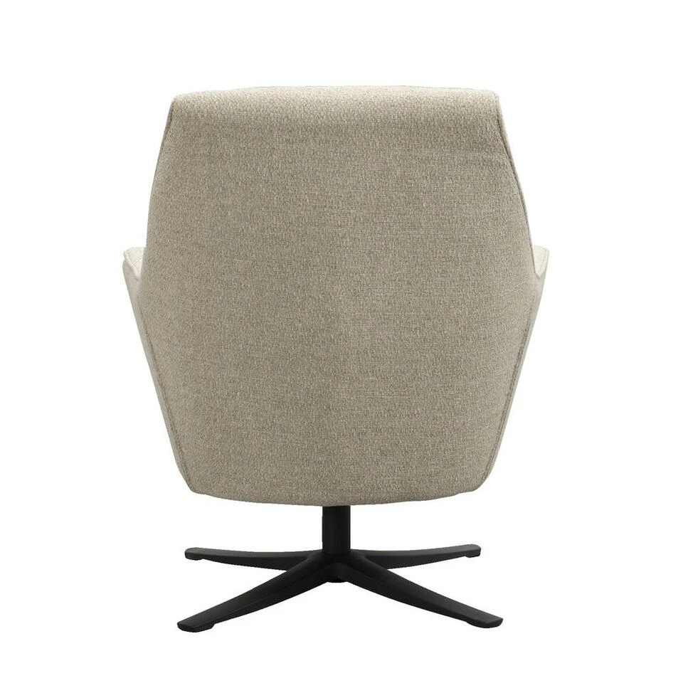 Fauteuil Nilesto heeft een moderne look. De stoel is bekleed met stof Grace in de kleur zand. Het onderstel is gemaakt van zwart metaal en is draaibaar. Deze stoel zit heerlijk en is een echte eyecatcher in je interieur. De fauteuil heeft een afmeting van 92x74x77 cm.