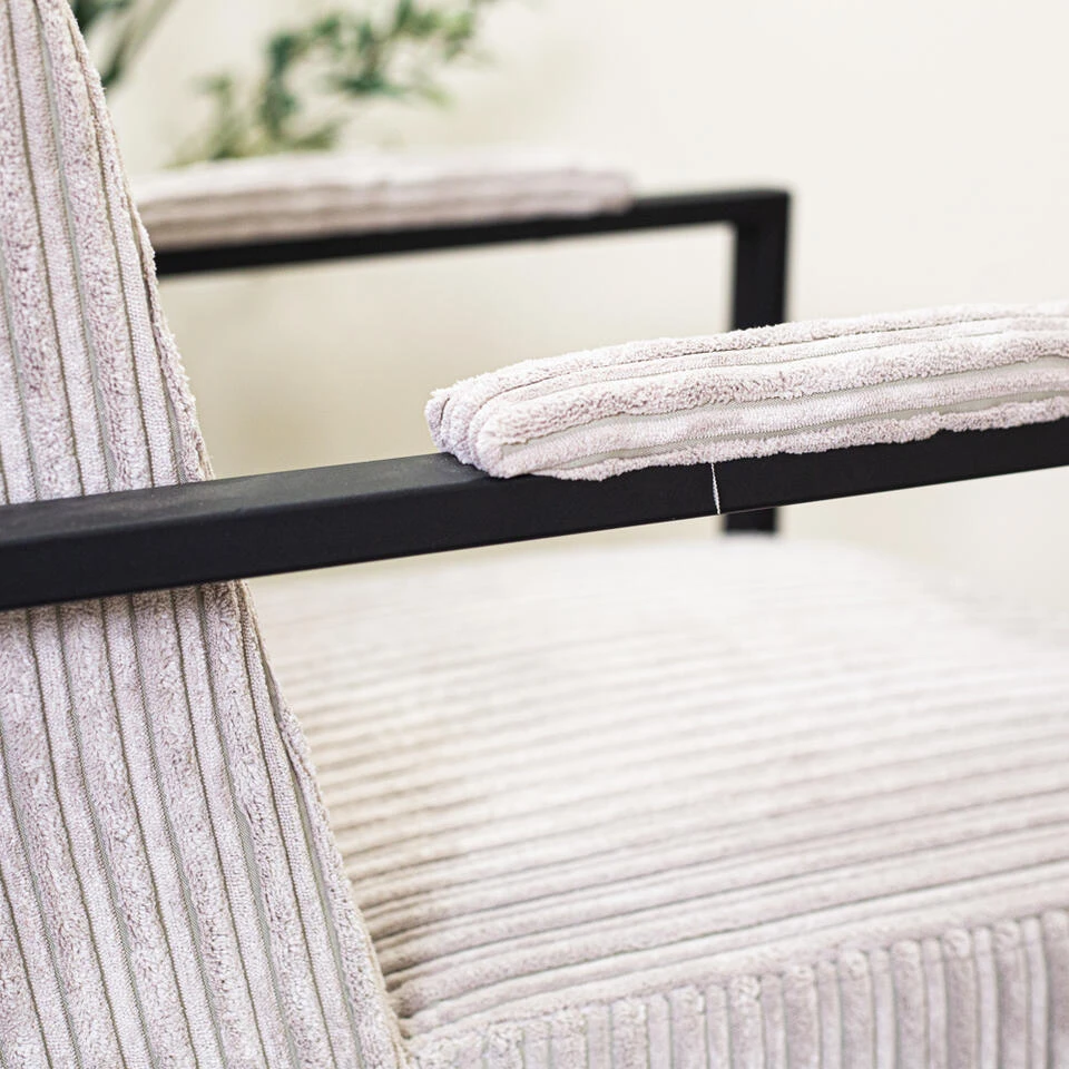 Fauteuil Madeline is gemaakt van ribstof. Ribstof kenmerkt zich door de zachte ribbels in de lengterichting van de stof en wordt ook wel corduroy genoemd. Ribstof staat bekend als een fijne bekleding met weinig onderhoud. De kwaliteit is zeer goed waardoor ribstof zeer sterk is en geschikt is voor intensief woongebruik. Een bijkomend voordeel van ribstof is dat het goed bestand is tegen zonlicht dankzij het gebruik van synthetische vezels. De fauteuil Madeline is erg sterk en kan daarom jaren lang mee.